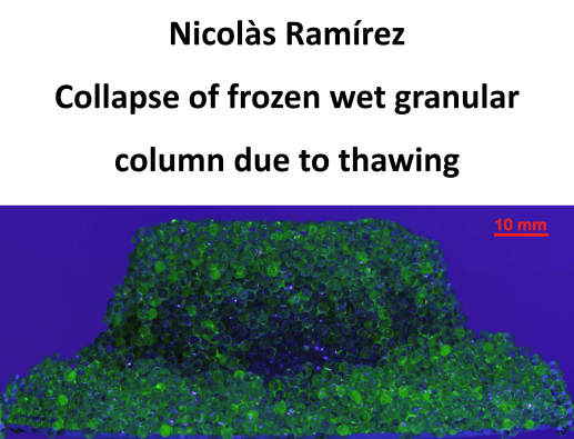 Permafrost degradation leads to ground instabilities driven by thaw-induced loss of cohesion. This mechanical destabilization is one of the processes responsible for triggering landslides and slope failures in cold-region environments. In this seminar, I present recent progress on the stability of frozen wet granular columns, used as a laboratory model for such processes.