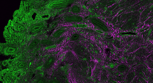 Legend : Endometrium–myometrium junction in a patient with adenomyosis: endometrial glands invading the collagen-rich myometrium. SHG microscopy – Cochin Institute.
