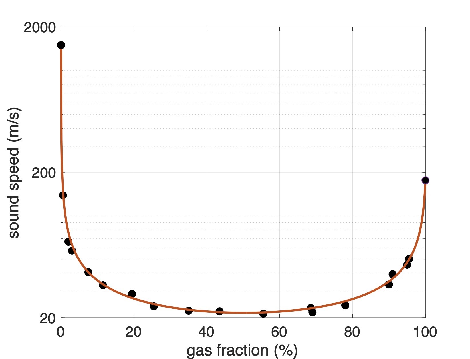 Figure. Vitesse du son en fonction de la fraction volumique de gaz. Les points correspondent aux mesures, le trait rouge à la prédiction de Wood.