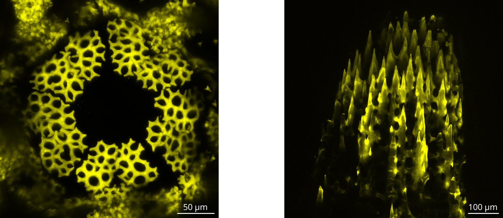 Microscopie confocale à balayage, projection maximale. Calcium ajouté sur le stéréome pendant une nuit dans la coquille d’un juvénile en formation (gauche) et dans l’épine d’un adulte en régénération.